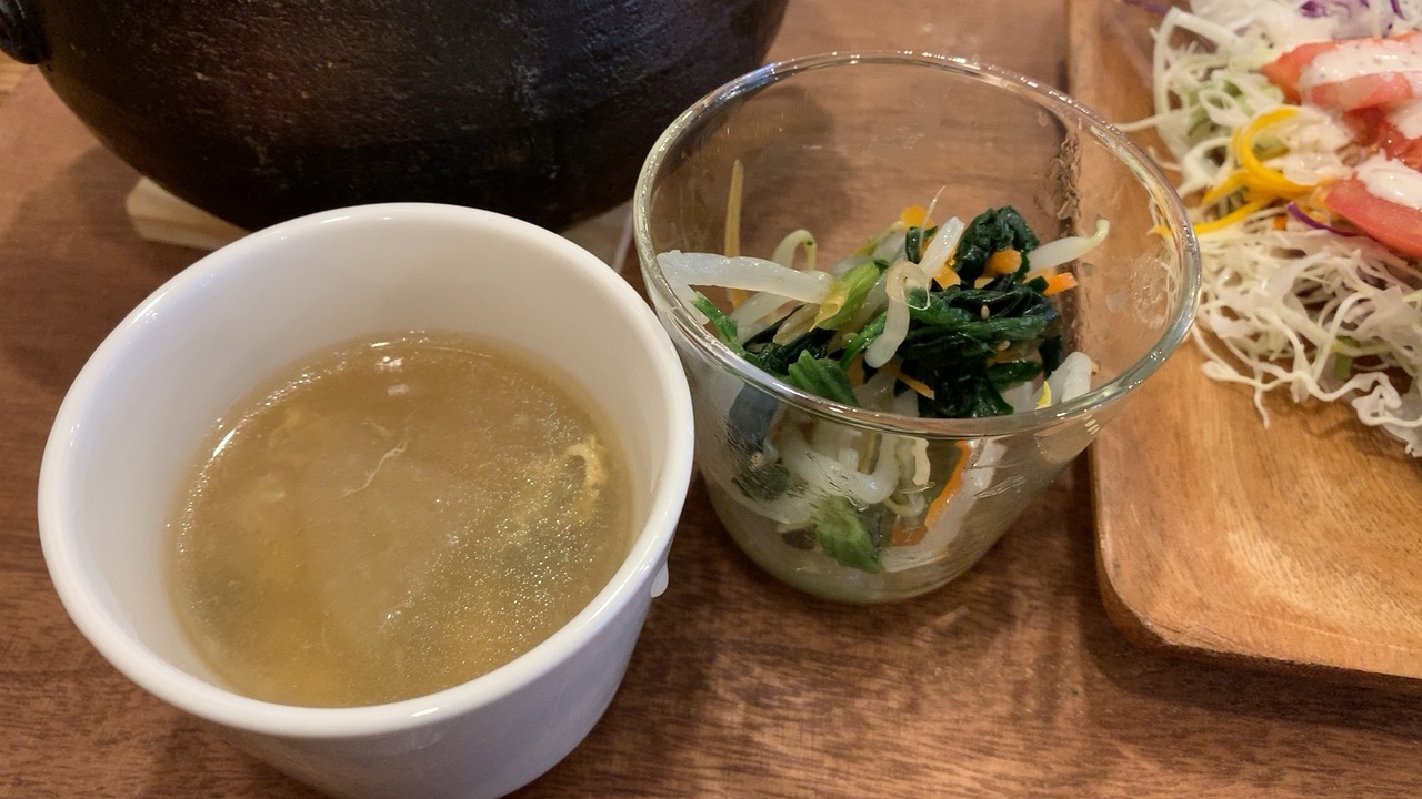 スープにもやしとほうれん草の和え物。