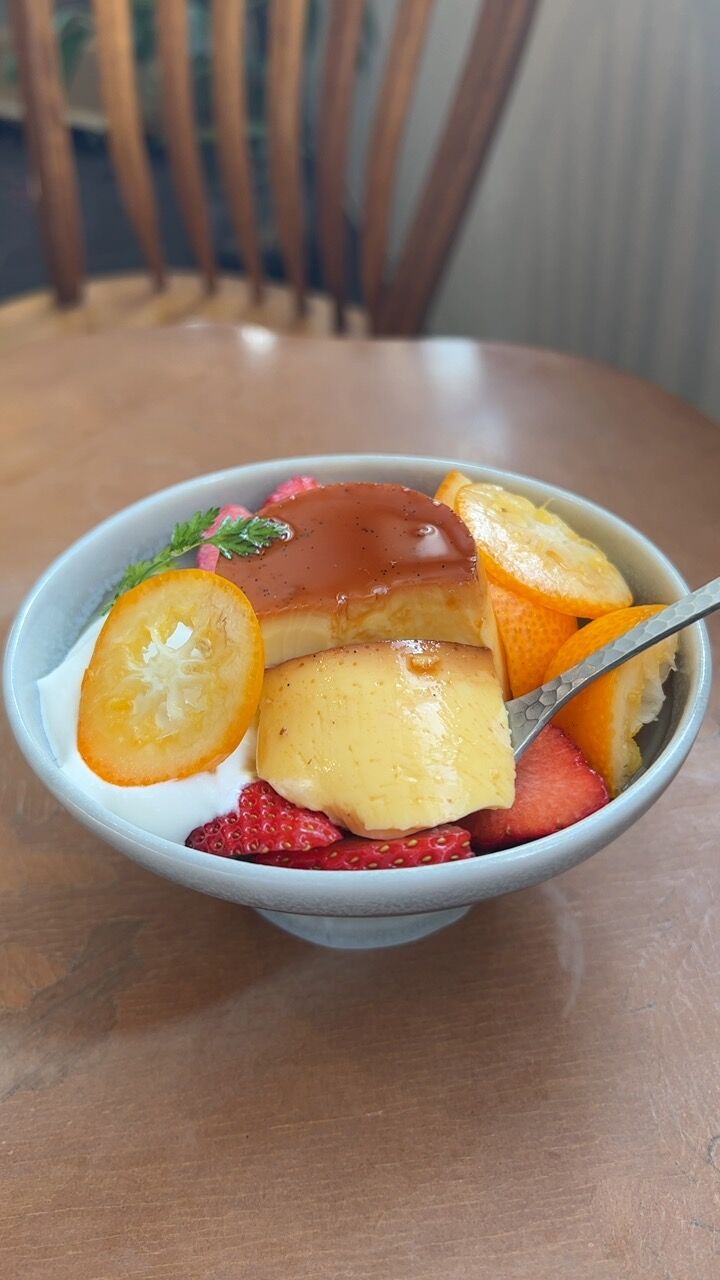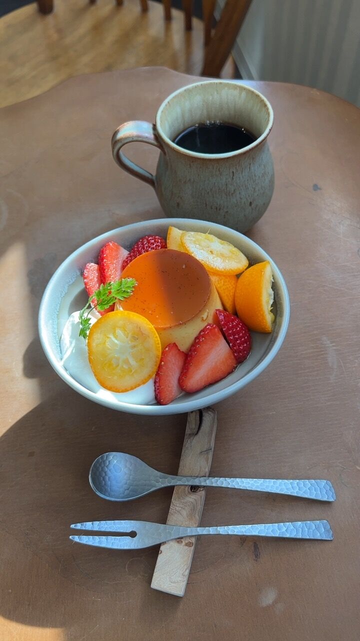 ブレンドのホットにヨード卵のプリン果物添えをオーダー。