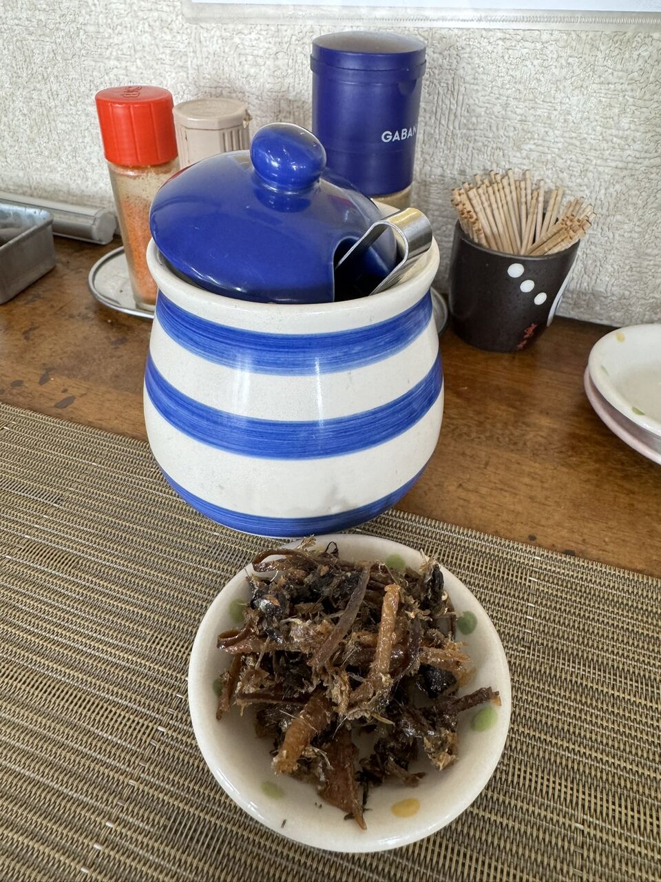 富いちさんと言えば定番の煮干しの佃煮をつまみながら待ちます。